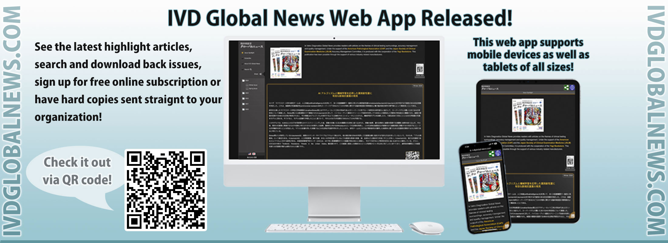 In Vitro Diagnostics Global News provides readers with articles on the themes of clinical testing surroundings, accuracy management and so on. Under the support of the American Pathological Association (CAP) and the Japan Society of Clinical Examination Medicine (JSLM) Accuracy Management Committee, it is produced with the cooperation of the Space Museum Yagi Bookstore (issued in January, April, July, and October). This publication has been possible through the support of the following industry related manufacturers.