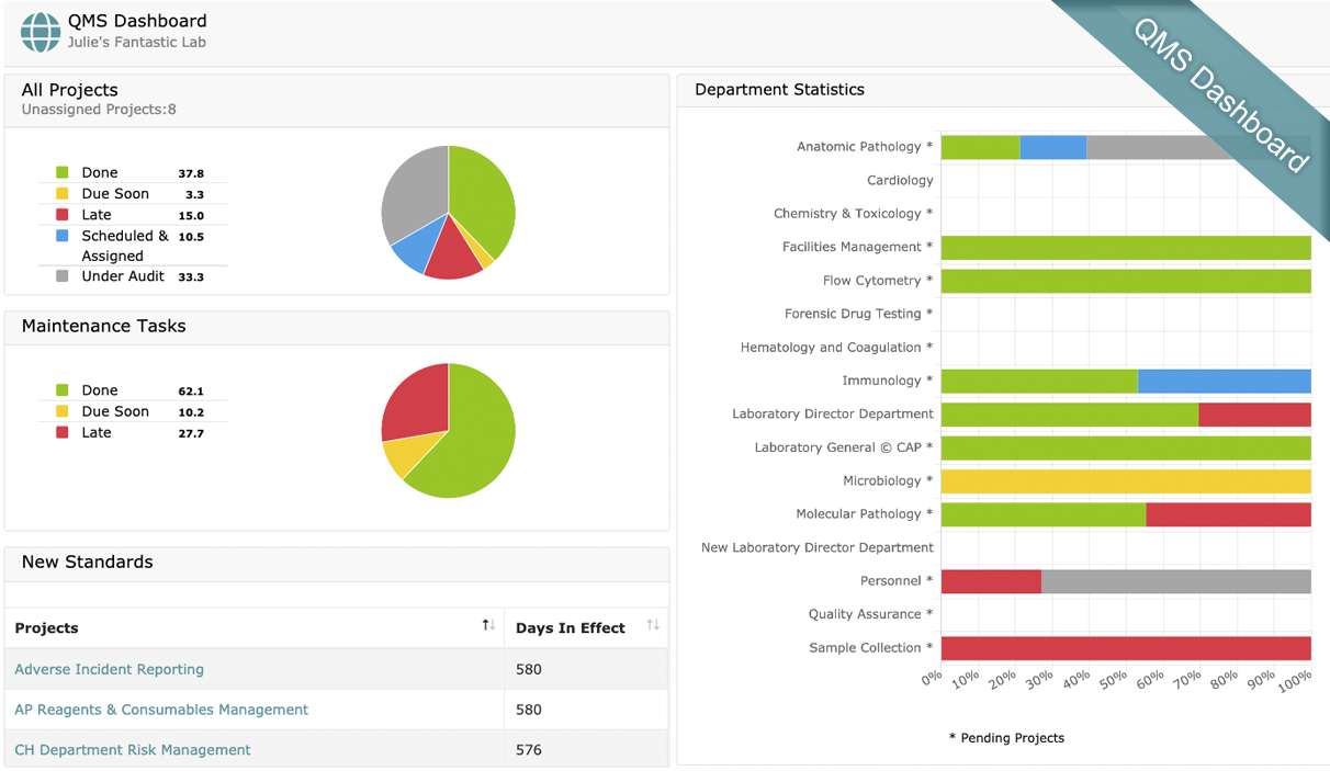 Once your laboratory has begun the gap analysis process and started completing projects, the overall status of your laboratories various departments will start being reflected on the QMS Dashboard, the first screen you see upon logging into LEAP. For a quick look at the overall status of your laboratories projects and maintenance, simply check the All Projects and Maintenance Tasks pie graphs. Department specific data is shown in separate line graphs under the Department Statistics section and you can get specific percentages when you hover your mouse above a specific department. Addtionally, projects with New Standards as well as Late Projects are listed below so you can quickly address these projects.