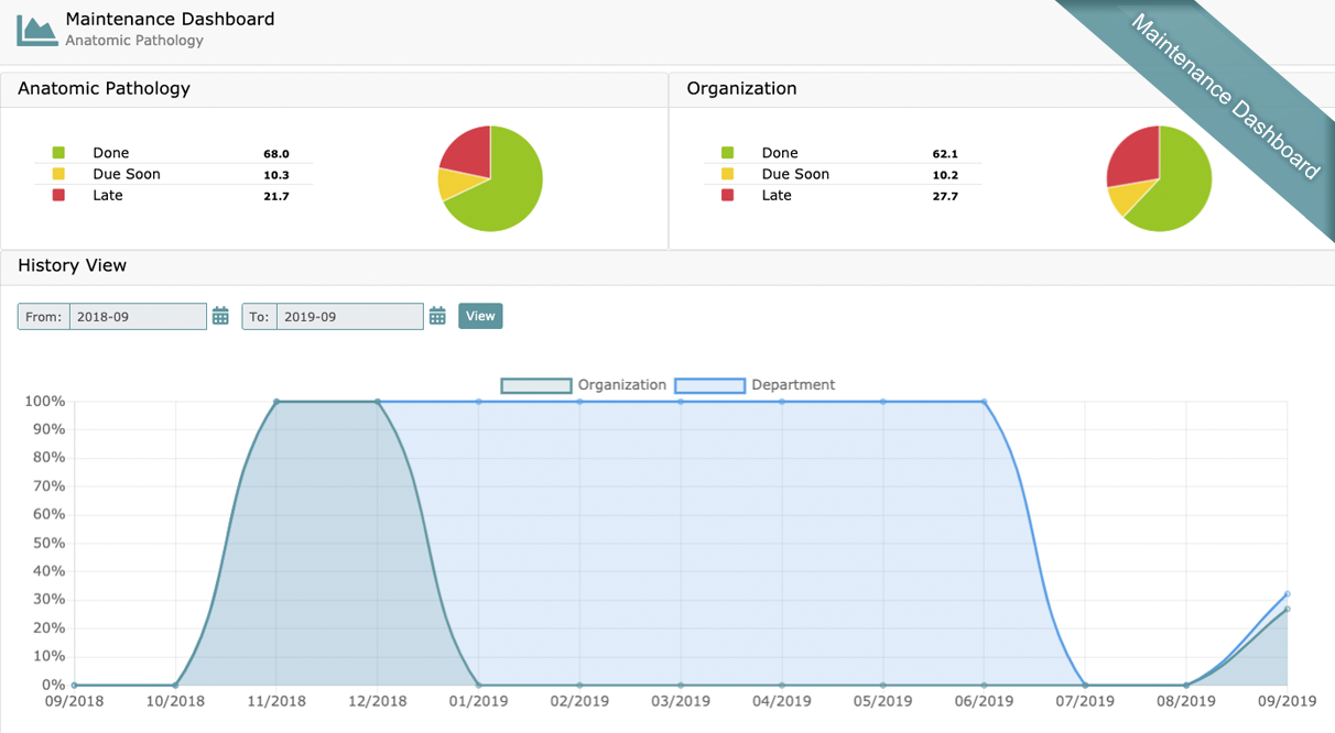 For a more detailed view on maintenance information the Maintenance Dashboard gives you a historical view of your maintenance tasks. The historical view helps you identify patterns in regular work behavior to help eliminate the tendency to try and finish all work just before an audit or inspection, helping to keep your laboratory in compliance throughout the year.