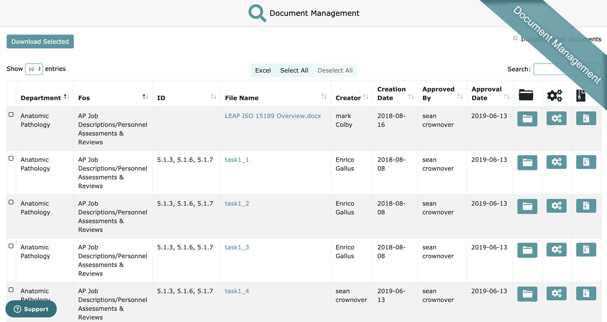 As projects become complete, the evidence saved within them becomes searchable via the Document Management page. Search from a number of parameters including filename, document creator, document approver, and much much more. Additionally, you can download documents and even share results in the form of an Excel document. Document Management page also gives you quick access to relative maintenance and archived versions of all completed projects.