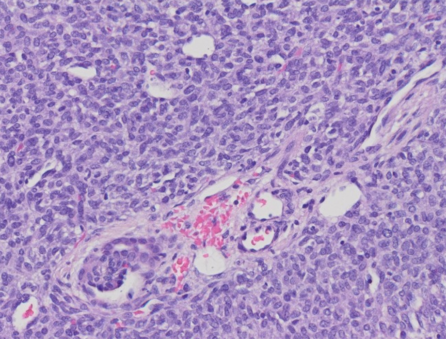 A 1-month-old boy presents with an abdominal mass. Imaging demonstrates a 10 cm solid mass centered in the right kidney. A nephrectomy is performed and shows an unencapsulated mass with tan cut surfaces and focal hemorrhage. The mass does not extend beyond the renal capsule. Immunohistochemical staining is positive for SMA and negative for desmin, WT1, and CD34. INI1 immunohistochemical expression is retained.