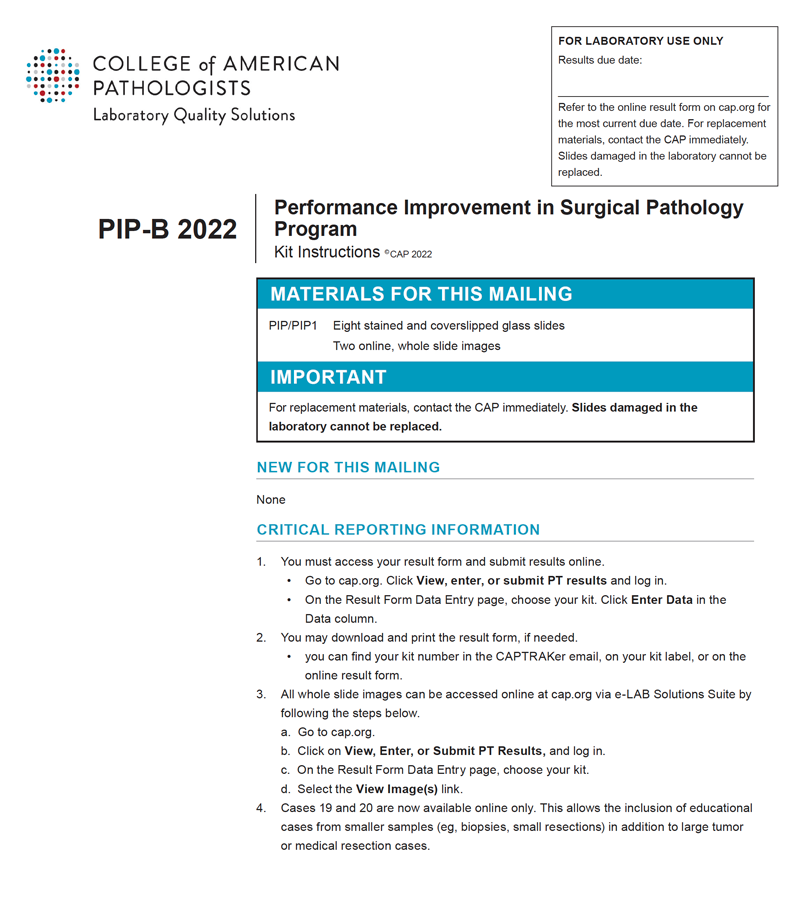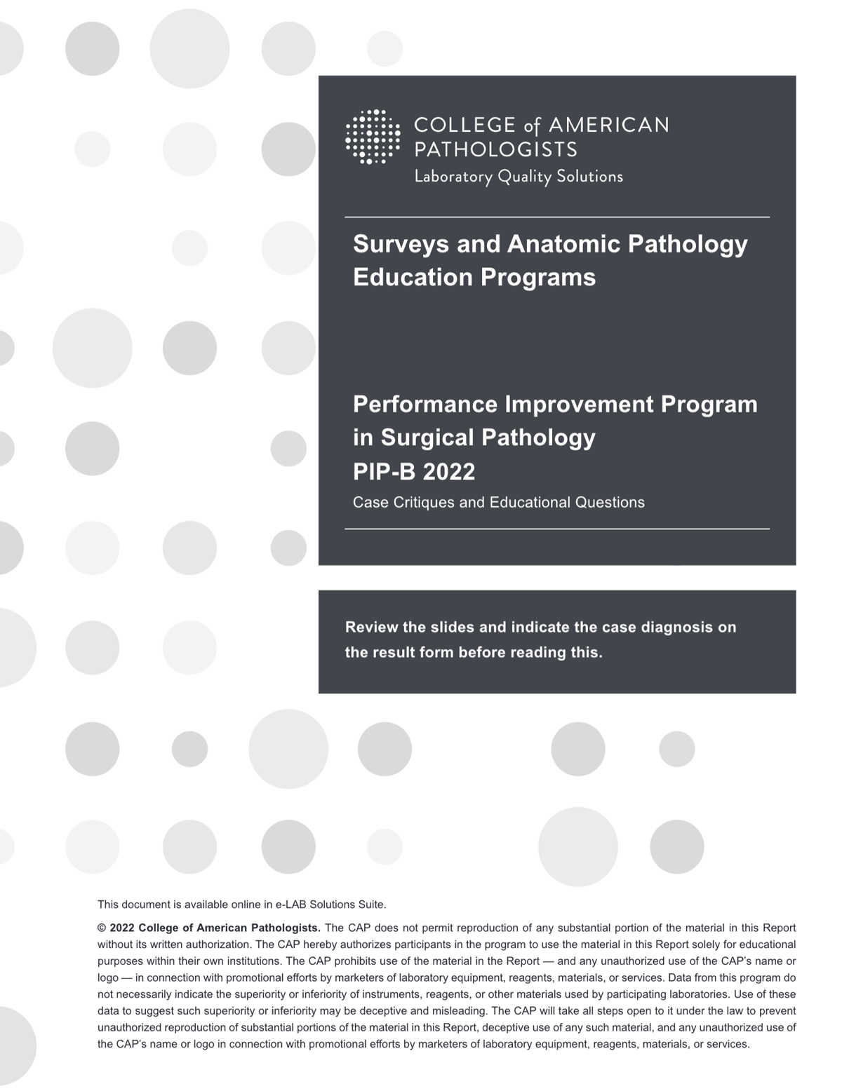 症例に関する詳細が記述された「解説書」は、CAPのホームページにログイン後、該当サーベイの解答サイトにて入手出来ます。詳細は参加お申込後お知らせします。