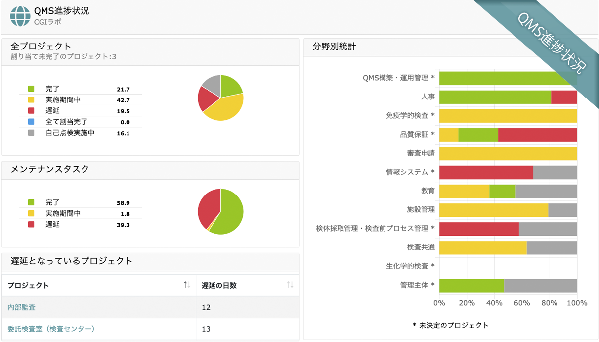 プロジェクトベースのギャップ分析からタスク割り当て、進捗の可視化・統計表示まで、検査室全体の品質活動を一元管理できます。